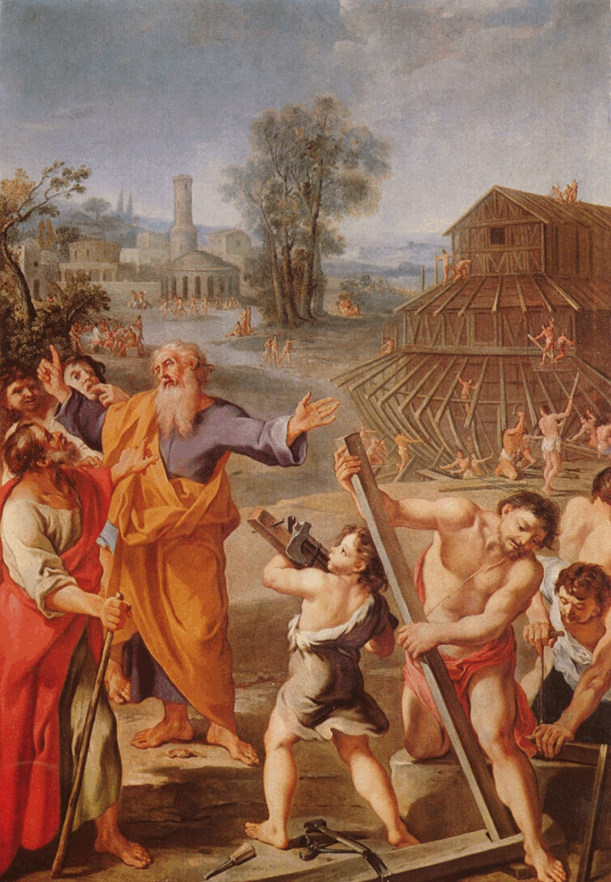 Según el Antiguo Testamento, Noé (cuando tenía 600 años) fue el que, por instrucciones de Dios, construyó el arca que permitió a él, sus hijos, su mujer, y las mujeres de sus hijos (Génesis 6:18), así como a todas las especies animales, macho y hembra que reunió, sobrevivir al gran Diluvio Universal, porque Dios hizo llover sobre la Tierra 40 días y 40 noches (Génesis 7:4) para terminar con la humanidad. Y terminado éste, hizo una alianza con Dios, que fue simbolizado con un hermoso arco iris. Según este pacto, Dios prometió a Noé no volver a inundar jamás la Tierra (Génesis 9:8-19).