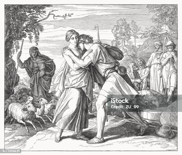 Ilustración de Jacobo y Raquel Grabado en Madera. Publicado en 1860. https://media.istockphoto.com/id/1472105639/es/vector/jacob-y-raquel-grabado-en-madera-publicado-en-1860.