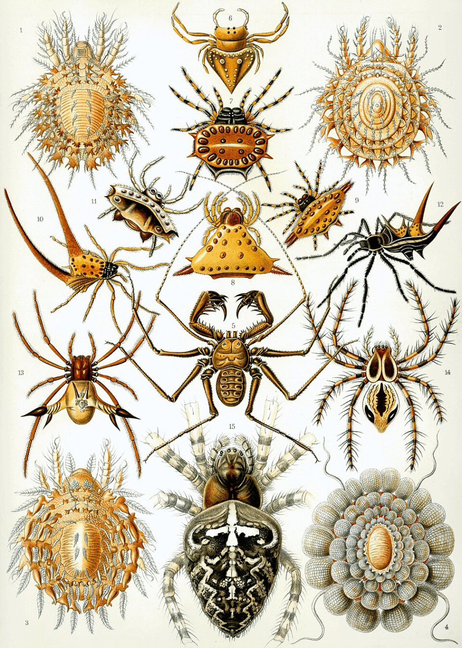 «Arachnida» en la obra de Ernst Haeckel, Kunstformen der Natur, 1904. Imagen de https://es.wikipedia.org/wiki/Arachnida#/media/Archivo:Haeckel_Arachnida.jpg