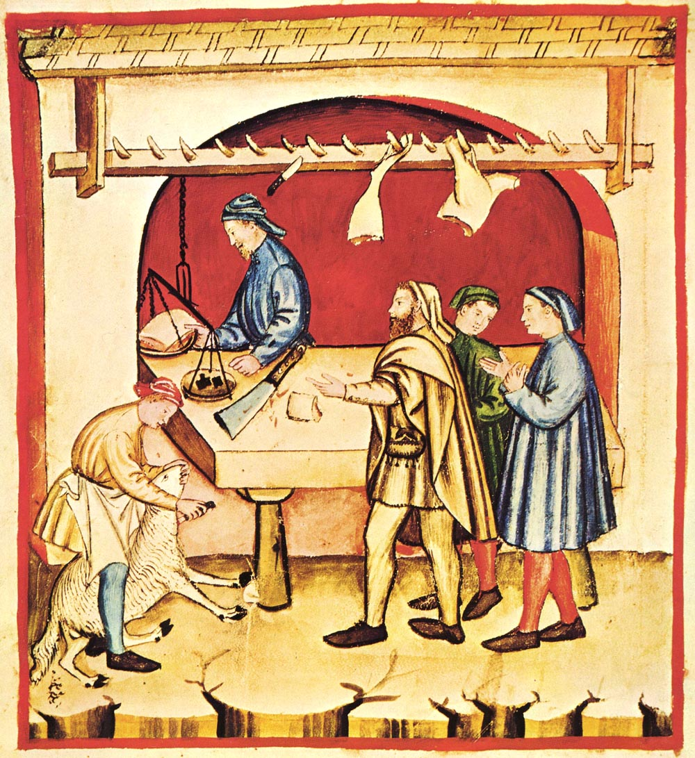 La profesión de carnicero era de mucho prestigio durante la Edad Media. https://commons.wikimedia.org/wiki/File:11-alimenti,carni_ovine,Taccuino_Sanitatis,_Casanatense_4182.jpg