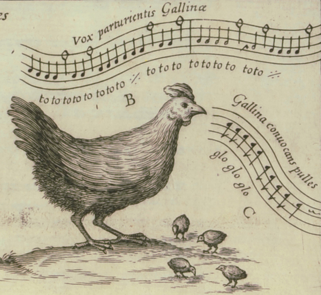 Según Musurgia Universalis (1650), la gallina hace «to to too» y los pollitos «glo glo glo». https://en.wikipedia.org/wiki/Onomatopoeia#/media/File:Kircher-musurgia-bird-song,_chicken.jpg