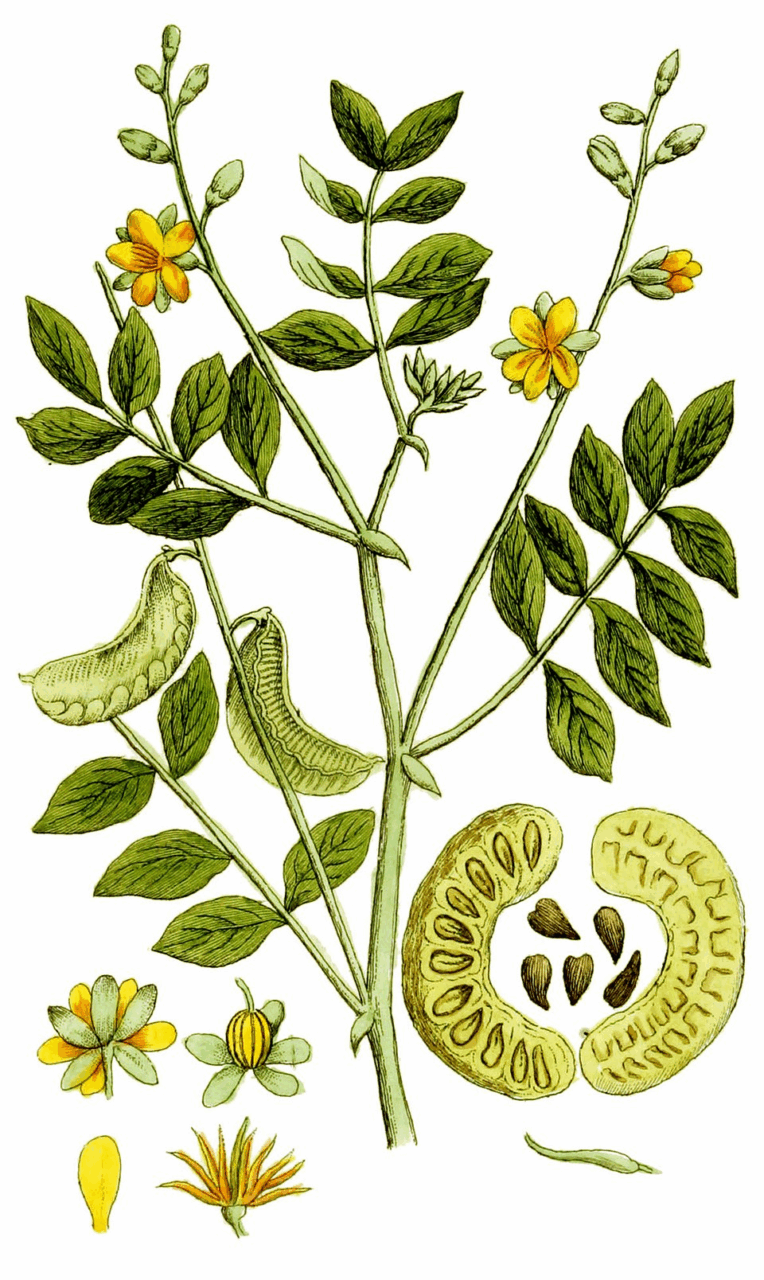El sen (Senna alexandrina Mill) y otros remedios se han utilizado como purgantes, lo que se consideraba un remedio drástico. Autor: Adolphus Ypey. https://commons.wikimedia.org/wiki/File:Cassia_senna_Ypey80-cropped.jpg