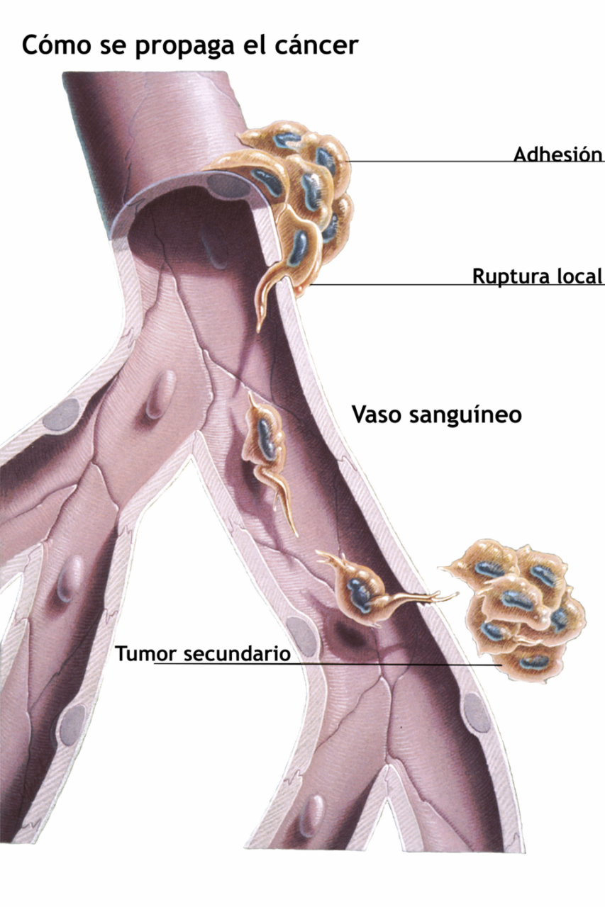 Esta ilustración titulada «Cómo se propaga el cáncer» explica el proceso de la metástasis. Autor Jane Hurd (Illustrator). Imagen de https://commons.wikimedia.org/wiki/File:Metastasis_illustration-es.png