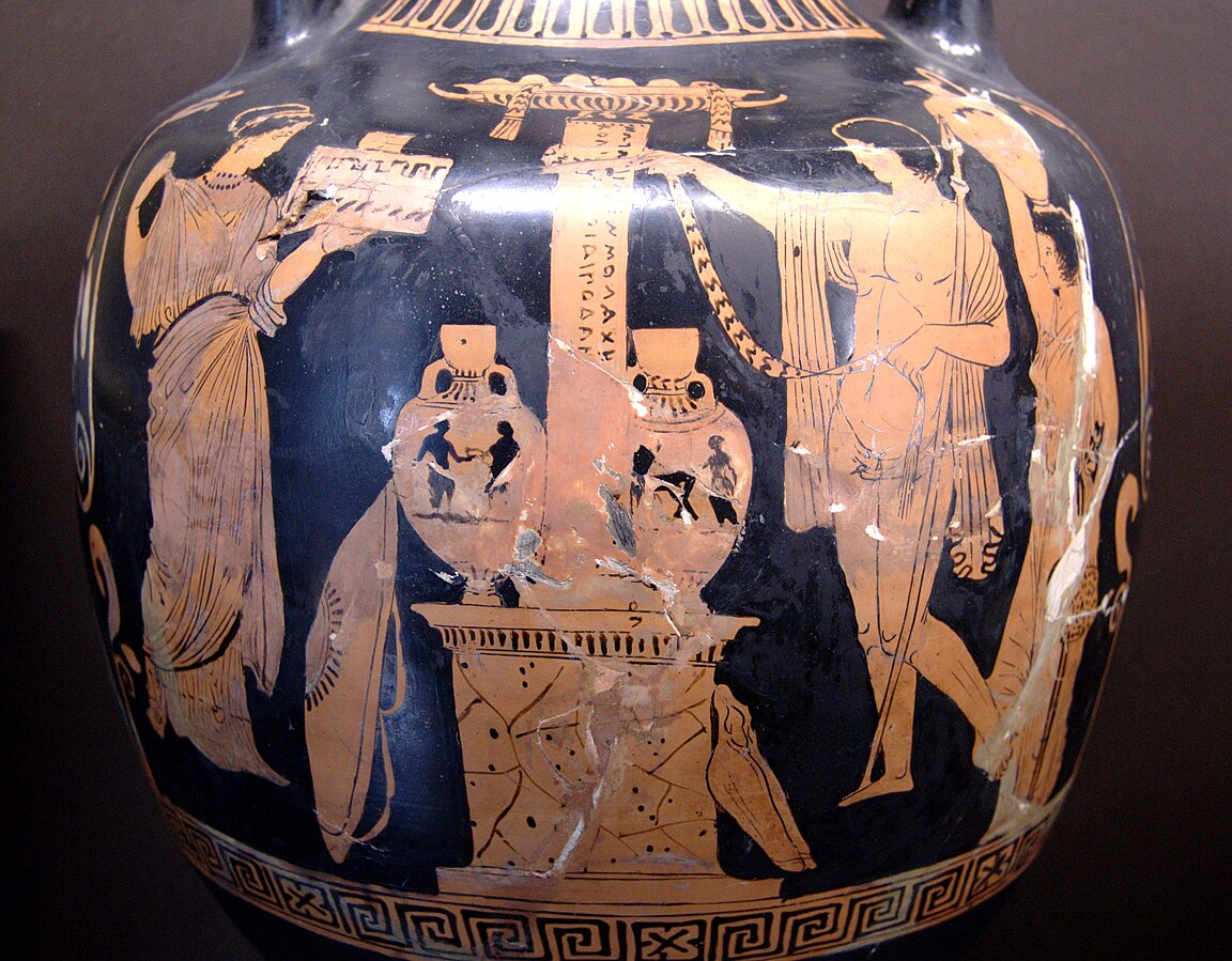 Una reliquia. Ánfora que representa el culto heroico griego en honor a Edipo. Cerámica roja de Apulia, 380-370 a. C. https://commons.wikimedia.org/wiki/File:Hero_cult_Louvre_CA308.jpg