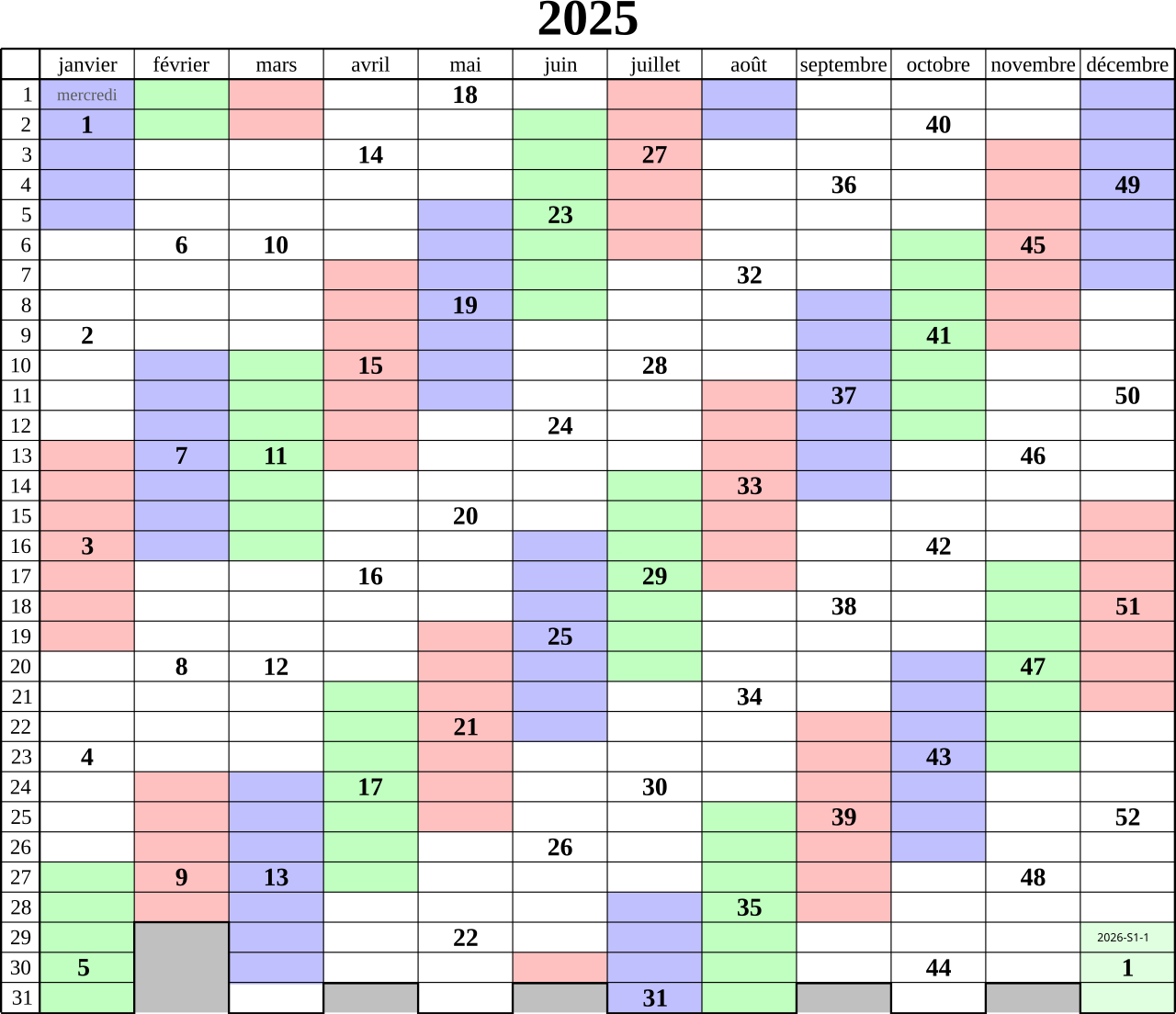 Calendario para el año 2025 con numeración de semanas según la norma internacional ISO (de lunes a domingo). Autor: Cdang. Imagen de https://commons.wikimedia.org/wiki/File:Semaines_ISO_de_l%27ann%C3%A9e_2025.svg